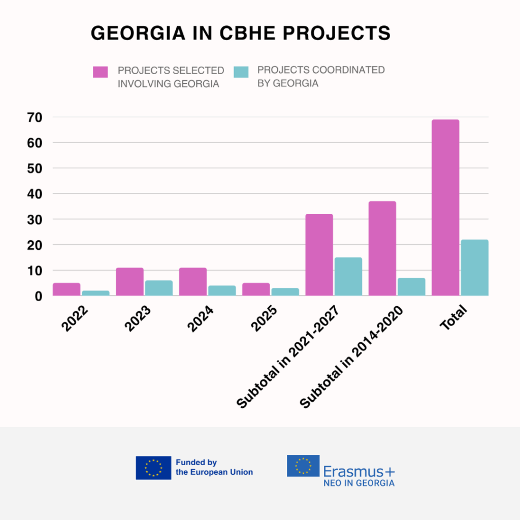2025 წლის შედეგებით, საქართველო, უმაღლეს განათლებაში შესაძლებლობების განვითარების (CBHE) პროგრამის ფარგლებში დაფინანსებულ, ხუთ პროექტში ჩაერთო. მათ შორის, 3-ში კოორდინატორის როლში, ხოლო 2-ში კი პარტნიორის. პროექტები, რომლებშიც საქართველო პარტნიორის როლშია წარმოდგენილი რეგიონთაშორის (Cross Regional) ტიპის პროექტებს განეკუთვნება.