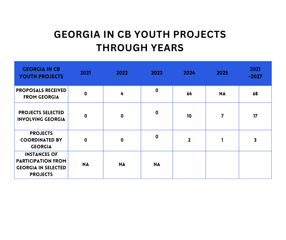 ცხრილი 1 – საქართველოს მონაწილეობა CB Youth პროექტებში წლების განმავლობაში