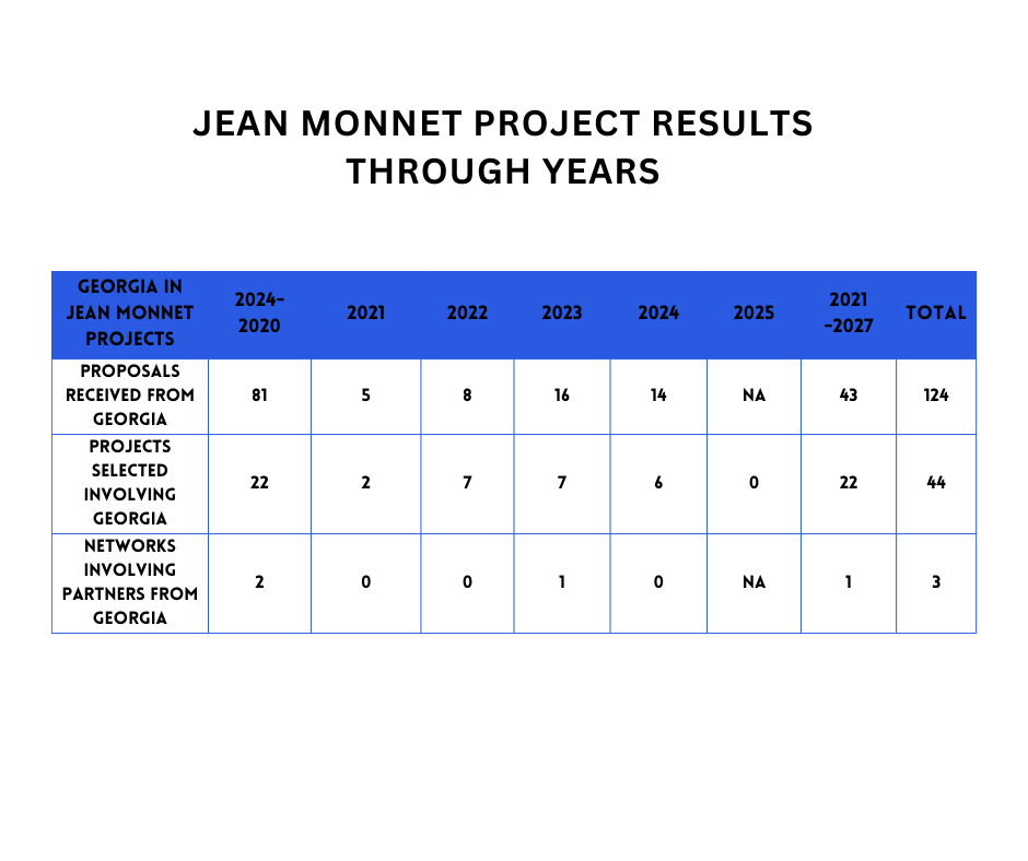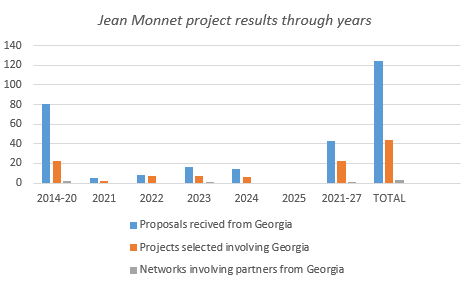2014 წლიდან 2020 წლამდე საქართველოდან წარდგენილი 81 ჟან მონეს განაცხადიდან 22 პროექტი შეირჩა, რაც ევროკავშირის კვლევებში საქართველოს მზარდ ჩართულობას ასახავს. მიმდინარე Erasmus+-ის პროგრამის ციკლში კი (2021–2027), საქართველომ უკვე მიაღწია 2014-2020 წლების მაჩვენებელს, 43 განაცხადიდან  22 პროექტი უკვე შერჩეულია (ცხრილი 1, სქემა 1).