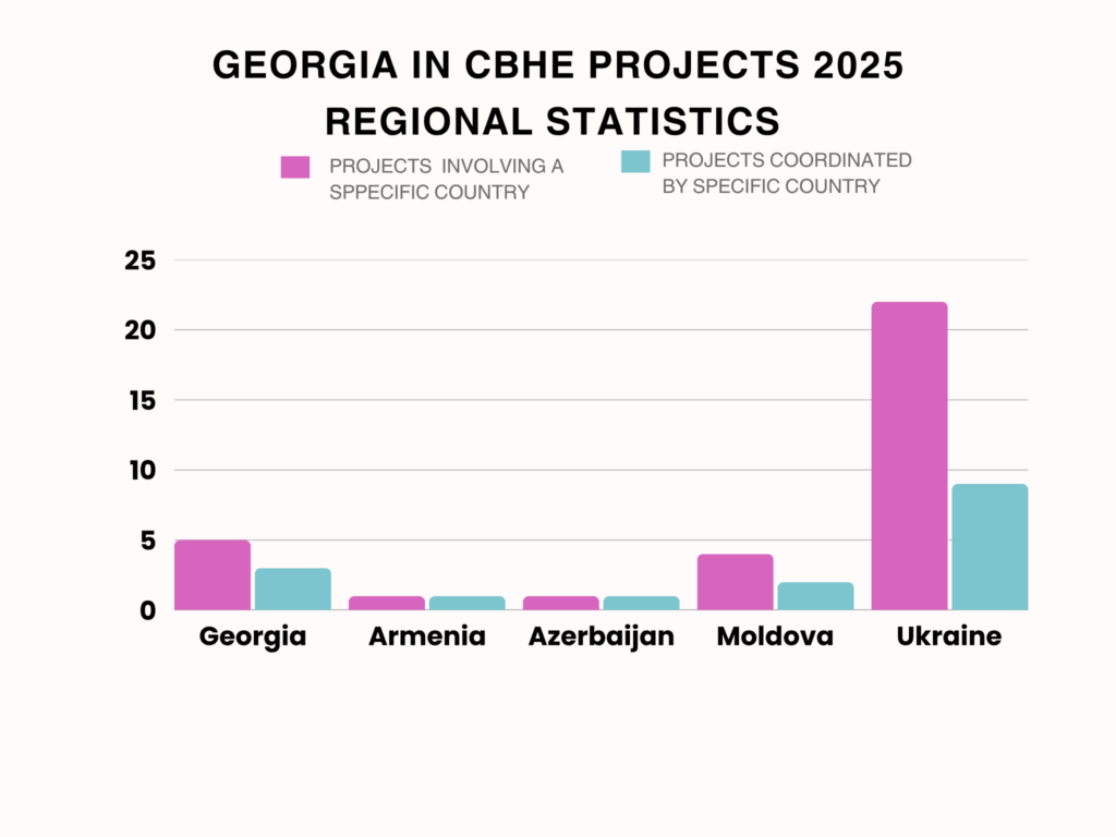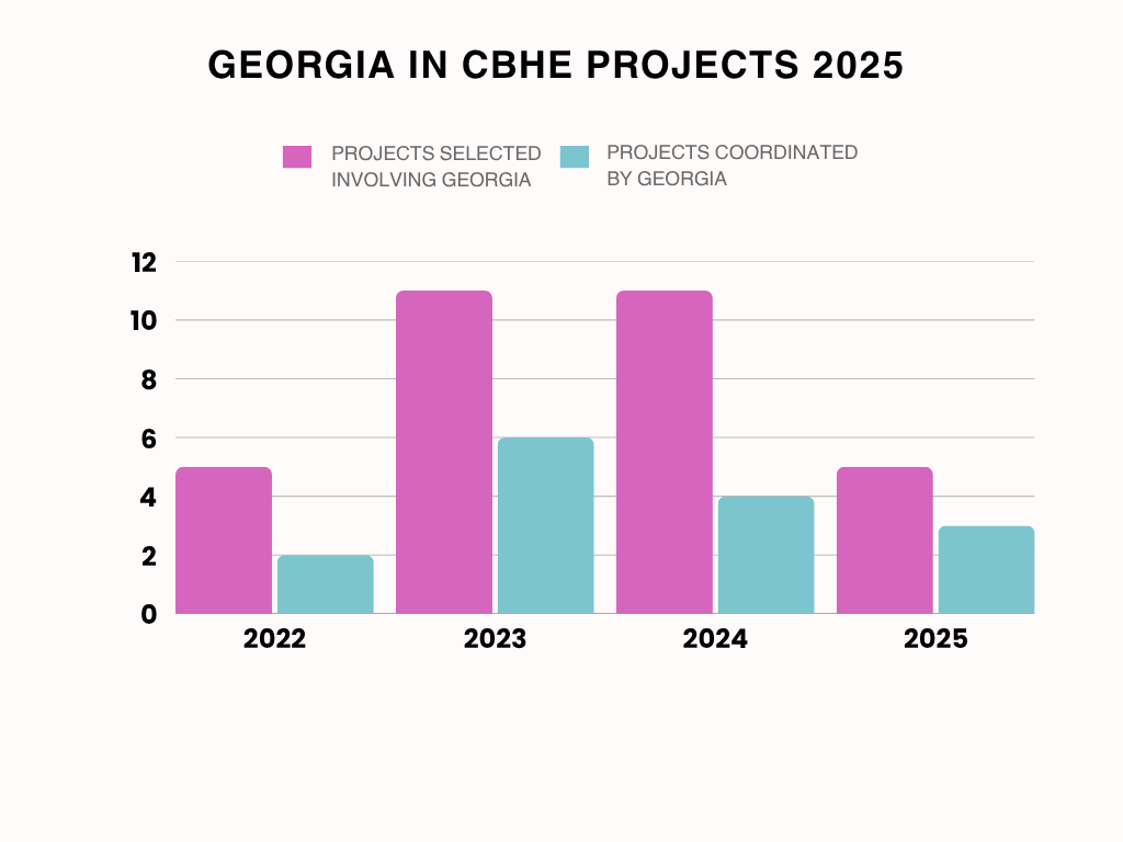 აღსანიშნავია, 2025 წელს საქართველოს მონაწილეობით გამარჯვებულ პროექტებში დაფიქსირებულია საქართველოს 18 მონაწილეობა. რომელთაგანაც, ერთი ინსტიტუცია სამ სხვადასხვა პროექტში იყო ჩართული, რაც ნიშნავს იმას რომ CBHE პროექტებში საქართველოდან 16 უნიკალური ორგანიზაცია მონაწილეობს.